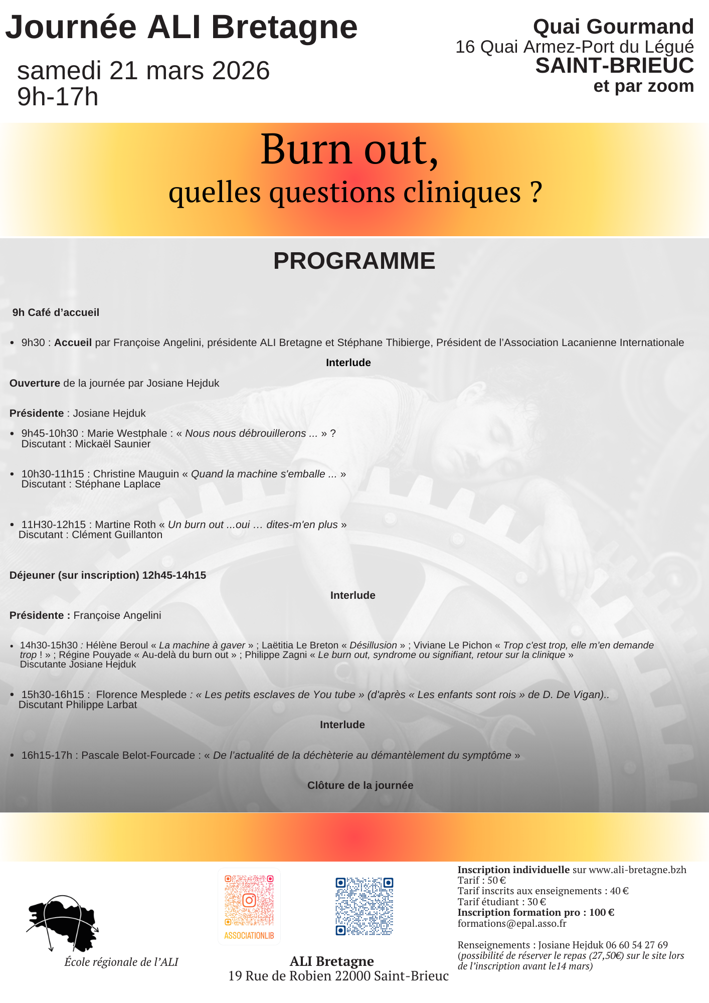 "Burn-out", cet anglicisme issu du monde professionnel et évoquant un incendie du corps et du psychisme, consumant le sujet, est utilisé largement de nos jours. Ce terme vient nommer des situations cliniques variées, sans doute à différencier. Il interroge aussi ce qui peut permettre à un sujet de "tenir" ou bien de "se tenir". Quels sont ses contours ? Comment éclairer ce mot avec nos concepts psychanalytiques ? C'est ce que nous tenterons de faire lors de cette journée de travail.